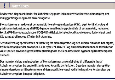 Alzheimers sygdom (AS) er den hyppigste demenssygdom. Siden 2007 er flere forslag til reviderede diagnostiske kriterier blevet publiceret, hvilket gør det muligt at stille AS-diagnosen væsentligt tidligere end før [1-5]. De nye kriterier, der alle inkorporerer validerede biomarkører, er tænkt til såvel klinisk brug som til forskningskriterier. Allerede nu anvendes biomarkører rutinemæssigt i danske og udenlandske hukommelsesklinikker. Efterhånden som opmærksomheden om demens vokser i befolkningen, forventes flere patienter med meget milde symptomer at blive henvist til udredning, hvilket forventeligt medfører en stigning i biomarkøranvendelse. Ydermere kan fremtidig behandling vise sig at være mere effektiv,