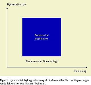 Initialt vil det hydrodynamiske tryk i frakturdiastasen være lavt, mens hastigheden af væsketransport og interfragmentær belastning vil være relativt høje. Fibroblaster tilkommer, der produceres callus og kollagen, og matrix bliver stivere. Callus øger stivheden over frakturen, matrixtrykket øges, og den relative hastighed af væsketransport og belastning på cellerne aftager. Med stigende hydrostatisk matrixtryk og aftagende belastning kommer der tiltagende mængder kondrocytter. Efterhånden som der produceres mere kollagenholdig matrix, aftager hastigheden i væskefaserne og belastningen fortsat. Sideløbende uddifferentieres osteoblaster med endokondral ossifikation til følge. For at hele ossøst skal frakturmiljøet altså bevæge sig i retning af belastninger, der udløser øget kollagensyntese og brodannende callus (se Figur 1 ). Det er plausibelt, at mesenkymale celler simpelthen ikke kan uddifferentieres til skeletogene celler og kondrocytter uden, at der foreligger et passende biofysisk miljø [3, 6].
