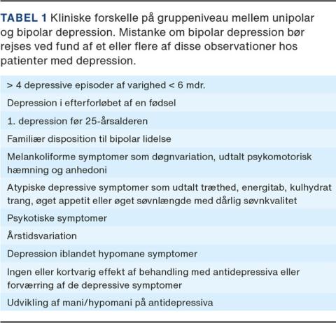 Patienten med BAL søger ofte læge pga. depression, og her gælder det om at identificere BAL. Tidligere manier vil patient og pårørende ofte informere om, men tidligere hypomanier kan være vanskelige at få belyst. Der er ved BD sammenlignet med UD på gruppeniveau visse karakteristika, som bør skærpe mistanken om diagnosen (Tabel 1) [1, 6, 7] Det væsentligste er en grundig undersøgelse for tidligere hypomani, som er den eneste måde, hvorpå diagnosen kan bekræftes.