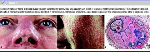 De kutane hamartomer ses hos BHD-patienter efter 20-30-års alderen og er af flere typer: Fibrofollikulomer (Figur 1) er det hyppigste fund og ses som små, 2-4 mm, hvidlige eller hudfarvede ovale tumorer af hudens hårfollikler, som kan forveksles med acne vulgaris. Modsat disse forsvinder fibrofollikulomerne dog ikke med tiden og er ikke pusholdige. Der kan forekomme alt fra nogle få til flere hundrede, og de findes oftest i ansigtet, på skalpen, i nakken samt øverst på overkroppen. De bliver ikke maligne, men fjernes alligevel ofte af kosmetiske årsager, da patienterne ofte føler dem meget stigmatiserende. I et kohortestudie havde 147 ud af 175 (84%) BHD-patienter hamartomer af typen fibrofollikulomer [11]. Andre typer er angiofibromer, trikodiskomer og perifollikulære fibromer, som ses alene, sammen med fibrofollikulomer eller i andre kombinationer [3]. De kutane hamartomer er ofte det første symptom på BHD, men ikke alle med BHD udvikler disse, hvilket kan besværliggøre diagnosen. I en af de seneste opgørelser over BHD-patienter var der i fem familier ud af 51 (10%) individer uden fibrofollikulomer, men i kun en af disse familier (2%) forekom der slet ikke kutane hamartomer, men denne familie havde dog andre af syndromets symptomer [3].