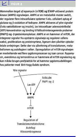 FLCN udgør en del af mammalian target of rapamycin (mTOR) og 5'AMP-aktiveret proteinkinase (AMPK)-signalvejen (Figur 2 ). AMPK fungerer som en vigtig energisensor i cellen, og mTOR-signalvejen fungerer som en af de vigtigste regulatorer for cellens vækst, proliferation og proteinsyntese, ligesom den påvirker cytoskelettet. Den C-terminale del af FLCN binder de follikulin-interagerende proteiner (FNIP)-1 og -2, hvorefter komplekset interagerer med AMPK og hæmmer mTOR [9, 10]. mTOR og AMPK virker tilbage på ekspressionen af FLCN og FNIP1 [7, 9]. AMPK kan fosforylere FNIP1, hvorved ekspressionen af FNIP1 hæmmes. Når mTOR blokeres med rapamycin eller påvirkes af lavt aminosyreniveau, ses et kraftigt fald i FLCN-fosforylering. Det samme ses ved hæmning af AMPK. En nedsat mængde fosforyleret FLCN medfører reduceret FLCN-ekspression [9].