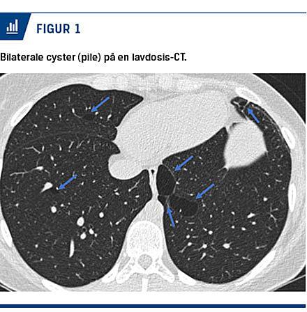 I forløbet blev der påvist normal lungefunktion ved dynamisk spirometri og mild anstrengelsesudløst laryngeal obstruktion ved laryngoskopi. En lavdosis-CT af lungerne to år efter den initiale HRCT viste cyster i alle områder af lungerne (Figur 1).