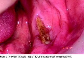 I underkæben blev der i regio -3,4,5 på toppen af processus alveolaris konstateret en 1,5 × 0,5 × 0,5 cm stor eksponeret knoglenekrose, der var fastsiddende og uden smertereaktion ved sondering med en pincet (Figur 1 ).