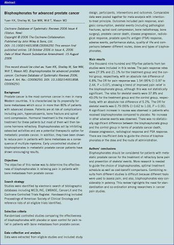 <li>Yuen KK, Shelley M, Sze WM et al. Bisphosphonates for advanced prostate cancer. Cochrane Database of Systematic Reviews 2006, Issue 4. Art. No.: CD006250. DOI: 10.1002/14651858.CD006205.</li>