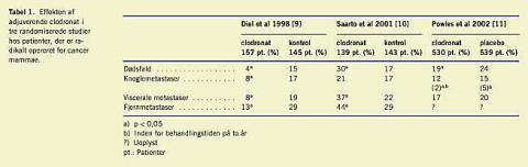 Der foreligger tre randomiserede studier [9-11] (Tabel 1 ). Det første studie omfatter 302 patienter, som blev randomiseret til enten kontrol eller clodronatbehandling [9]. Patienterne havde ved immunhistokemisk analyse fået påvist epiteliale antigener i knoglemarven som udtryk for subkliniske knoglemetastaser. Clodronatbehandling medførte en signifikant reduktion af både knoglemetastaser og viscerale metastaser, som var ledsaget af en signifikant reduktion i mortaliteten i clodronatgruppen fra 15% til 4%. I 2001 publicerede Saarto et al [10] resultater fra et randomiseret forsøg inkluderende 299 patienter, der blev randomiseret til kontrol versus adjuverende clodronatbehandling. I modsætning til i Diel-studiet [9] fandtes der ingen forskel på antallet af knoglemetastaser på kontrol- og clodronatgruppen. Antallet af recidivfrie patienter efter fem år var reduceret i clodronatgruppen i forhold til kontrolgruppen (p=0,007), og overlevelsen var signifikant kortere i denne gruppe. I 2002 blev det seneste forsøg publiceret [11]; 1.069 patienter blev dobbeltblindt randomiseret til placebobehandling versus clodronatbehandling i to år. Inden for behandlingsperioden fandtes en signifikant reduktion af knoglemetastaser, mens der efter opfølgning på mere end fem år var en ikkesignifikant reduktion i hyppigheden. Der var ingen forskel på hyppigheden af nonossøse recidiver i de to grupper, men clodronatbehandling medførte en signifikant reduktion i mortaliteten i forhold til placebobehandling.