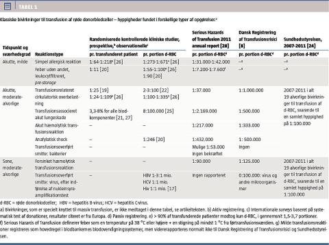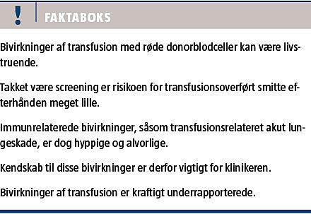 Blodtransfusion med røde donorblodceller (d-RBC) kan være livreddende ved akutte blødninger [1]. Anæmi medfører risici i form af bl.a. øget mortalitet og morbiditet i forbindelse med operationer og er især farlig for patienter med kardiovaskulære lidelser [1-3]. Anæmi bør behandles efter årsag, men ved klinisk betydende anæmi kan blodtransfusion være nødvendig. Bivirkninger af blodtransfusioner forekommer med forskellig hyppighed og sværhedsgrad, og kendskab til disse er nødvendigt for at kunne afveje fordele og ulemper ved transfusion i det enkelte tilfælde [4].