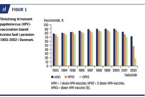 Vaccination med Gardasilvaccinen er siden den 1. januar 2009 blevet tilbudt piger i 12-årsalderen som en del af det danske børnevaccinationsprogram. Derudover har piger/kvinder, der var født mellem 1985 og 1997 fået tilbud om gratis vaccination i en række catch up-programmer for at opnå størst mulig tilslutning til vaccinationsprogrammet. Indtil august 2014 blev HPV-vaccinen givet i et tredosisprogram til alle. Siden er den givet i et todosisprogram til piger i alderen 9-13 år, mens personer over 13 år fortsat anbefales at få tre doser. I Danmark er tilslutningen til HPV-vaccination faldet betydeligt i de seneste år (Figur 1) [9]. Hvor 90% af piger født i 1998-2000 fik en dosis, 86% fik to doser, og 82% fik alle tre doser, fik kun 71% af piger født i 2002 den første dosis, 48% fik to doser, og kun 18% fik alle tre doser. Ca. 75% af piger født i 1985-1992 har fået første dosis, mens 56% har fået alle tre doser [10]. Faldet i andelen af 12-årige piger, der har fået tre doser HPV-vaccine, til 18% kan delvist forklares ved, at man i august 2014 overgik til at give kun to doser til denne aldersgruppe. I perioden fra den 1. januar 2009 til den 30. juni 2015 blev der i alt solgt 1.651.152 doser af den quadrivalente HPV-vaccine i Danmark [11]. I samme periode er mere end 500.000 piger og kvinder blevet vaccineret, mens ca. 13.391 mænd pr. 22. januar 2016 har indløst en recept på en HPV-vaccine. På verdensplan er der givet mere end 175 millioner doser vaccine.