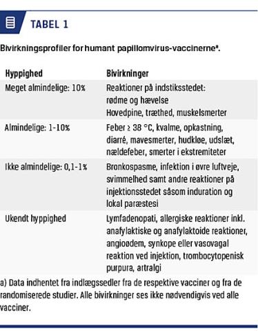 De kendte bivirkninger af HPV-vaccinen, som er hyppigst forekommende og almindeligvis ikke skal anmeldes til Lægemiddelstyrelsen, er angivet i Tabel 1. Fra HPV-vaccinen blev introduceret i Danmark til og med den 30. juni 2015 er der indrapporteret mulige bivirkninger hos i alt 1.586 personer [11] (~ 0,3% af de vaccinerede), af dem var ca. 27 mænd. Ca. 543 indberetninger (< 0,1% af de vaccinerede personer) er klassi-