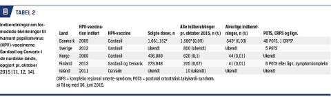 I de fleste nordiske lande anbefaler man ligesom i Danmark HPV-vaccination med Gardasil (fra den 1. januar 2016 er Gardasil erstattet med Cervarix i børnevaccinationsprogrammet. Denne beslutning skyldes udelukkende, at Cervarix er billigere end Gardasil). Sammenlignet med de øvrige nordiske lande er der langt flere indrapporterede bivirkninger i Danmark, men der er også blevet givet flere doser af HPV-vaccinen i Danmark end i de øvrige nordiske lande (Tabel 2), hvilket formentlig skyldes, at Danmark sammen med Island var først til at implementere vaccinen i børnevaccinationsprogrammet [15]. Andelen af formodede bivirkninger af HPV-vaccinen i forhold til solgte doser er dog stort set ens i Danmark (0,08%), Norge (0,1%) og Finland (0,07%), ligesom andelen af alvorlige bivirkninger er meget ens i landene (Tabel 2) [14].