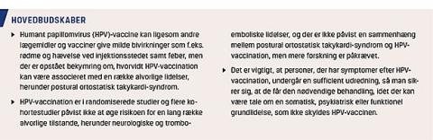 rede kvinder, der var henvist til Synkopecentret på Frederiksberg Hospital pga. ortostatisk intolerans, havde POTS, mens ~ 90% blev diagnosticeret med kronisk træthedssyndrom. Da man ikke i nogen af disse studier inkluderede en kontrolgruppe, og de bygger på stærkt selekterede grupper af henviste patienter, er det ikke muligt herudfra at konkludere, at der er en øget risiko for POTS og CRPS hos HPV-vaccinerede personer.