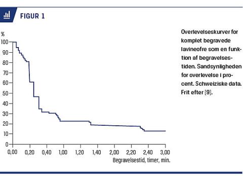 3) tilstedeværelse af en luftlomme og frie luftveje samt 4) sværhedsgraden af evt. traume. For komplet begravede er mortaliteten 52,5%, mens den blot er 4,2% for partielt begravede [8]. For komplet begravede lavineofre er overlevelsen inverst relateret til begravelsestiden (Figur 1). Således tyder en opgørelse af schweiziske og canadiske data på, at overlevelsen er højere end 80% ved en begravelsestid på op til 20 minutter [9]. Herefter sker der et dramatisk fald til en overlevelse på blot 30% blandt ofre, der har været begravet i op til 35 minutter. Denne hastigt faldende overlevelseskurve tilskrives først og fremmest asfyksi, som i det hele taget er den væsentligste dødsårsag ved lavineulykker [9, 10]. Dødeligheden falder langsomt efter den kritiske fase efter omkring 35 minutter med en relativt flad kurve frem til 90 minutters begravelsestid (Figur 1). Dette formodes at være begrundet i tilstedeværelsen af luftlomme og frie luftveje kombineret med det fysiologisk nedsatte iltforbrug sekundært til hypotermi, og hos netop sådanne ofre er der beskrevet overlevelse uden sequelae efter lange begravelsestider af mere end to timers varighed, svær hypotermi ned til 19 °C og hjertestop [11, 12].