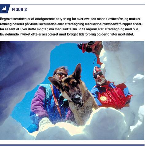 Hos komplet begravede lavineofre finder der en hurtigt indsættende hypoksi, hyperkapni samt hypotermi sted, og kombinationen af disse kan have en ugunstig effekt på overlevelsen [13]. Da hovedårsagen til mortalitet ved lavineulykker således er asfyksi, og det ydermere er kendt, at overlevelsen falder hastigt med begravelsestiden, er det klart, at et vist antal af de lavinerelaterede dødsfald kan undgås ved hurtig udgravning af lavineofrene. Mhp. dette anvendes der ved alpint skiløb uden for de sikrede områder normalt sikkerhedsudstyr i form af en lavine-transceiver/-bipper i den hensigt, at et komplet begravet offer skal kunne lokaliseres hurtigere. Der er evidens for, at dette sikkerhedsudstyr afkorter begravelsestiden og mindsker mortaliteten [14], ligesom begrænsede mængder data indikerer, at såkaldte lavineairbags (rygsæk med indbygget airbag) kan forhindre komplet begravelse ved lavineulykker [14]. Hvor makkerredning enten ved visuel lokalisering af et inkomplet begravet lavineoffer eller hurtig udgravning af et begravet lavineoffer svigter, er dødeligheden ekstraordinært høj [15]. Man må her sætte sin lid til organiseret eftersøgning ved sondering eller eftersøgning med lavinehunde (Figur 2). En sådan redningsaktion vil være forbundet med forsinkelse, og den kan være kompliceret af utilgængelige lokalisationer, vejrforhold samt fortsat lavinefare, og overlevelsen er derfor ofte lav [15].