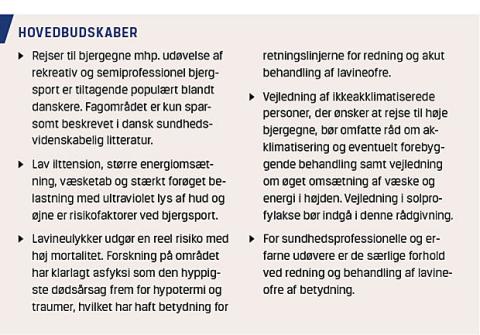 i akklimatiseringen ved højdepåvirkning, danner baggrund for forståelsen af komplikationer i form af forværring af præeksisterende sygdomme og akut højdesyge, hvilket behandles i del II af denne artikel. Forskning i lavineulykker har bidraget til at rykke forståelsen af lavinen som den uforudseelige hvide død til en reel risiko, der kan reduceres ved vidensbaseret forebyggelse, og hvor begravelsestiden er styrende for indsatsen ved redning og behandling af lavineofre. Ekspositionen for UV-lys er massiv ved mange former for bjergsport og medfører risiko for skader på hud og øjne, hvilket ikke altid erkendes fuldt ud af udøverne. Risikoen for frostskader er ikke behandlet i denne artikel, men bør indgå i vejledningen af rejsende til høje bjergegne.
