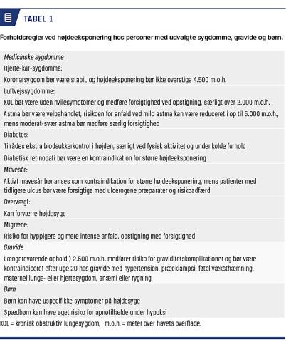 Der henvises til første del for en introduktion til området og en gennemgang af medicinske aspekter af alpine farer inklusive risici ved laviner og udsættelse for ultraviolet lys. I denne del gennemgås højdesyge, væske og ernæring i højden samt særlige forholdsregler for personer med kendte sygdomme samt de risici, der er forbundet med højdeeksponering hos gravide og børn (Tabel 1).