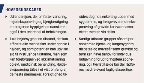 I to artikler er de medicinske aspekter af bjergvandring og højdeeksponering gennemgået på et overordnet plan. Rejser til højtbeliggende egne er forbundet med øget risiko hos særlige grupper, såsom personer med hjerte- og lungesygdom, diabetes og mavesår samt gravide og børn, og disse personer kan forud for sådanne rejser have behov for individuel rådgivning.