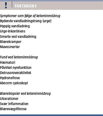Således indikerer resultaterne af et engelsk studie, at ca. 20% af ketaminmisbrugerne har alvorlige symptomer fra urinvejene [18]. Der rapporteres om hele spektrummet af nedre urinvejs-symptomer samt smertefulde blærekramper, dysuri og mikroskopisk og makroskopisk hæmaturi [6-8, 19-21].
