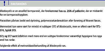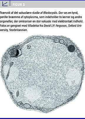 Blastocystis er en i Danmark almindeligt forekommende, encellet tarmparasit, som kan findes hos personer med eller uden gastrointestinale (GI) og ekstraintestinale symptomer [1, 2]. Parasitten er beslægtet med alger, diatomer og lignende og hører til gruppen af Stramenopiles. Blastocystis' livscyklus kendes ikke nøjere, men cystestadiet er formodentlig det infektiøse stadie og den form, der kan overleve uden for værten. Andre in vivo- og in vitro-stadier indbefatter vakuolære, multivakuolære, avakuolære, granulære og amøboide stadier. Cysterne måler 3-5 mikrometer, hvorimod vakuolære stadier måler typisk 4-15 mikrometer (Figur 1 ); i kultur kan disse opnå størrelser på ca. 200 mikrometer. Granulære stadier er måske degenerative stadier og ses ofte i hendøende kulturer. De øvrige stadier er kun sparsomt beskrevet i litteraturen [2]. Parasitten menes at overføres fækooralt, enten direkte eller indirekte via f.eks. forurenet drikkevand eller fødevarer, og der er tiltagende evidens for et zoonotisk reservoir [2-4]. I Danmark findes parasitten hos ca. en fjerdedel af patienter, der er mistænkt for en tarmparasitsygdom som f.eks. rejserelateret eller persisterende diarre [5], men ofte som blandingsinfektion med andre tarmparasitter, f.eks. Dientamoeba fragilis. Den er dermed en af de hyppigste tarmparasitter herhjemme. Prævalensstudier fra andre lande melder om meget forskellige forekomster, men disse data afspejler i varierende grad valg af diagnostiske metoder (se nedenfor).