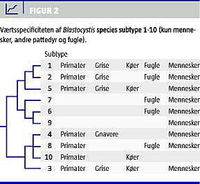 De seneste ti års forskning har vist, at parasitten udviser stor genetisk diversitet [2-4, 6]; p.t. anerkendes mindst ti subtyper (ST) hos mennesker, pattedyr og fugle [4, 6] (Figur 2 ). Den genetiske afstand mellem disse subtyper er op til 7%, hvilket eksempelvis er fire gange afstanden mellem den patogene Entamoeba histolytica og den apatogene E. dispar, og subtyperne repræsenterer sandsynligvis forskellige arter. Mennesket er oftest vært for ST3, men også ST1, ST2 og ST4 forekommer med vekslende hyppighed [4]. Derimod forekommer ST5-ST10 kun sjældent hos mennesket, og det kan ikke udelukkes, at disse subtyper overføres hovedsagligt zoonotisk. ST6 og ST7 er isoleret hovedsageligt fra fugle, hvorimod f.eks. ST5 og ST8 er påvist i primater og andre større pattedyr og kun sjældent hos mennesker [4].