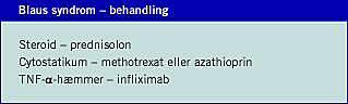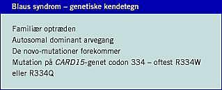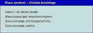Der er næppe tvivl om, at flere af de tidligt indsættende tilfælde af »sarkoidose« hos børn, hvor artritis og/eller eksantem og/eller uveitis dominerer det kliniske billede, formentlig drejer sig om Blaus syndrom [3, 4].