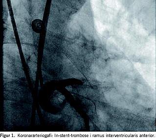 I. En 63-årig tidligere rask mand blev indlagt på mistanke om myokardieinfarkt (MI). Koronararteriografi (KAG) viste ste-nose af den venstre koronararterie. Der isættes en DES. Patienten var kardialt velbefindende med normal pumpefunktion, men udviklede et operationskrævende pseudoaneurisme svarende til punkturstedet i lysken. Mens patienten var i sit hjem før operationen pauseredes clopidogrel og ASA. Efter seks døgns clopidogrelpause fik patienten et uvarslet hjertestop, genoplivedes og overførtes til invasivt hjertecenter. Akut KAG viste en lukket stent (Figur 1 ), der blev genåbnet, og en ny DES blev indsat med et godt visuelt resultat. Stentlukningen havde forårsaget et stort infarkt som forårsagede nedsat pumpefunktion.