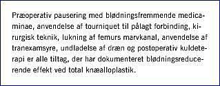 Peroperativt kan valg af anæstesimetode have betydning for blødningen og akut normovolæmisk hæmodilution eller hypotensiv epiduralanalgesi - men ikke en kombination heraf - reducerer den peroperative blødning (A ), hvilket kun er af relevans, såfremt tourniquet ikke anvendes. Anvendes tourniquet, influerer valg af anæstesimetode ikke på den totale blødning (A ).