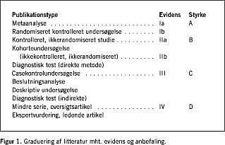 Litteratursøgning er foretaget primo maj 2003 på MEDLINE/PubMed (total knee arthroplasty and blood loss or bleeding or prevention of blood loss or hemostasis samt kombinationer af nedenfor nævnte tiltag og TKA eller blood loss ). Artikler på engelsk, tysk eller skandinavisk er udvalgt, og tiltag, der skønnes at være irrelevante for danske forhold, er udeladt. Der er fokuseret på tiltag, som har en blødningsreducerende effekt, og som er tilgængelige for de fleste ortopædkirurgiske afdelinger i dag. Publikationernes evidens er angivet i parentes efter hver reference, og konklusionens anbefalinger er styrkegradueret (Figur 1 ).