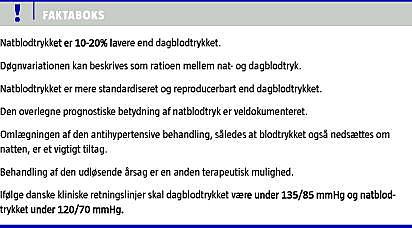Summary Blood pressure should not exclusively be measured during daytime Ugeskr Læger 2012;174(3):110-112 24-hour ambulatory blood pressure (BP) monitoring has major advantages over conventional BP measurement. The capacity to monitor BP throughout the full 24-hour allows the uncovering of abnormal nocturnal BP patterns. The current evidence shows that nighttime BP better reflects risk than daytime BP. Therefore, it is essential to control both daytime and nighttime BP to maximise the beneficial effects on clinical outcome of antihypertensive therapy. 24-hour ambulatory BP monitoring represents a unique tool to establish the most appropriate antihypertensive drug regimen for the individual patient.