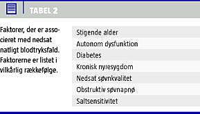 Omkring 30% af patienterne med kendt hypertension og 10% af personerne i den almindelige befolkning har ikke det forventede natlige blodtryksfald. Hyppigheden stiger med alderen og ved forringet søvnkvalitet eller søvnapnø. Ligeledes disponerer en række kliniske tilstande såsom nyresygdom, diabetes og andre lidelser med påvirket autonom kardiovaskulær regulering til non-dipping . I Tabel 2 opsumeres de hyppigste faktorer, der er associeret med nedsat natligt blodtryksfald. De patofysiologiske processer er komplekse, og ændring i den sympatiske modulation af blodtrykket [5] og/eller forstyrret baroreflekssensitivitet kan indgå [6].