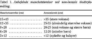 Blodtrykket måles på den let flekterede overarm med patienten siddende, idet god arm- og rygstøtte sikres. Manchetten anbringes tætsiddende på overarmen uden at give stase, således at manchettrykket omgående under inflation kan forplante sig til det underliggende væv. Manchetten skal anbringes direkte på huden og ikke fx uden på patientens (skjorte)ærme. Den bør placeres således, at underkanten er et par cm fri af albuebøjningen. Gummiballonen i manchetten skal nå helt rundt om armen, og have en bredde, der svarer til ca. 40% af overarmens cirkumferens. Tre manchetstørrelser (gummiballoner) bør være tilgængelige og vil kunne dække de fleste voksne patienters arme (Tabel 1). Til børn og voksne med tynde overekstremiteter anvendes en særlig børnemanchet. Manchetten opblæses hurtigt til 20-30 mmHg over det systoliske tryk, hvorefter blodgennemstrømningen i a. brachialis ophører (Fig. 1). Stetoskopets membran placeres ud for a. brachialis umiddelbart distalt for manchetten. Der tilstræbes en udluftningshastighed på 2 mmHg/hjerteslag. Det systoliske tryk registreres ved Ko-rotkoff fase I, hvor lyden høres første gang og det diastoliske tryk ved Korotkoff fase V, hvor lyden forsvinder helt. Hos børn kan det være nødvendigt at måle det diastoliske blodtryk ved fase IV, hvor lyden skifter karakter. Herefter tages trykket hurtigt af ballonen, og der bør hengå mindst et minut inden næste måling. Hvis ikke Korotkoff-lydene høres klart, kan det være en fordel at blæse manchetten hurtigt op, og eventuelt foretage opblæsning med armen eleveret, for herefter at sænke den under udluftningen.