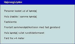Ifølge TK-kriterierne medfører en højenergiulykke alene tilkald af traumeteam (Tabel 1). Det fremgår ligeledes af tabellen, hvorledes en højenergiulykke er defineret.