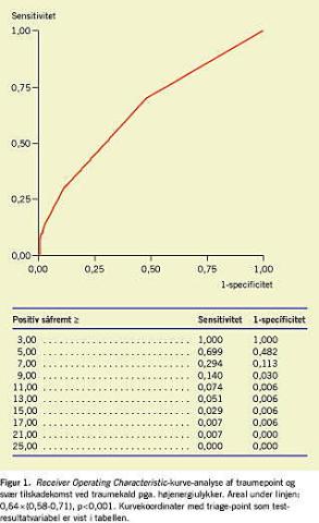 Resultater: I undersøgelsen indgik 514 traumepatienter. Af dem havde 304 været udsat for højenergiulykker. Den positive prædiktive værdi af traumekald til disse patienter var 45% for sværere skader. Blandt undergruppen af symptomfrie patienter fandtes en positiv prædiktiv værdi på 15%. Via ROC-kurve-analysen blev det optimale skæringspunkt for tilkald af traumeteam fundet. Dette svarede til en højenergiulykke og mindst et symptom og gav en sensitivitet på 70% og en specificitet på 52%.