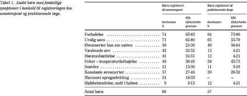De hyppigst nævnte symptomer var forkølelse og urolig søvn (Tabel 1 ). Zoneterapeuter angav hyppigere væskende ører, hørenedsættelse og hæmmet sprogudvikling, mens der var tendens til, at praktiserende læger hyppigere angav øresmerter kun om natten og feber/temperatu rforhøjelse. Forældrenes beskrivelse af børnenes symptomer svarede til zoneterapeuternes og de praktiserende lægers. Der var ikke forskel på forældregruppernes symptombeskrivelse.