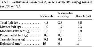 Børn, som udelukkende ammes, har et fedtindtag på ca. 50 E%, hvoraf 23 E% kommer fra mættet fedt (Tabel 1). Børn, der får modermælkserstatning, får næsten det samme, da man har tilstræbt samme fedtindhold og -sammensætning som i modermælk.