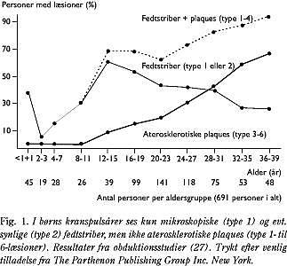 Graden af præ- og aterosklerotiske læsioner som funktion af alder er vist i Fig. 1. Fedtstriber anses for at være den tidligste aterosklerotiske læsion, men dette kan anfægtes, idet alle børn har fedtstriber i legemspulsåren (4, 5), og en årsagssammenhæng mellem fedtstriber og aterosklerotiske plaques kan betvivles (6). Børn udvikler ikke aterosklerotiske plaques, medmindre der foreligger et markant forhøjet plasma-kolesterol som ved homozygot familiær hyperkolesterolæmi (Fig. 1).