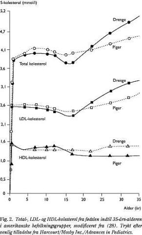 Kolesterolniveauet i plasma ændrer sig med alderen (Fig. 2). Total-, LDL- og HDL-kolesterol stiger meget i de første leveuger og ligger derefter nogenlunde konstant indtil omkring 15-års-alderen. Det kolesterolniveau, man ser i barndommen, er markant lavere end de værdier, man typisk ser hos voksne, der udvikler hjerte-kar-sygdomme. Da indholdet af mættet fedt er lidt højere i modermælk end i modermælkserstatning, og da kun modermælk indeholder kolesterol (Tabel 1), har ammede børn generelt et højere plasmakolesterol end ikkeammede. I mange studier har man undersøgt, om amning påvirker kolesterolniveauet senere i livet. I de fleste studier finder man ingen sammenhæng. Fedtindtaget i overgangskosten har også betydning for kolesterolniveauet, men betydningen af fedtmængde-, fedttype- og kolesterolindtaget kan ikke adskilles. I STRIP-studiet har man vurderet betydningen af fedtindtaget for lipidprofilen hos små børn. I studiet blev syv måneder gamle børns forældre randomiseret til enten at modtage en normal kostvejledning eller en intensiv kostvejledning om en kost med lige meget mættet, monoumættet og flerumættet fedt (interventionsgruppen). Ved 13-måneders-alderen havde børnene i interventionsgruppen et lavere indtag af både total fedt (26 E% vs. 28 E%) og mættet fedt (9 E% vs. 12 E%) (13). Drengene i interventionsgruppen havde ved treårsalderen 7% lavere serum-kolesterol (4,1 mmol/l vs. 4,4 mmol/l), mens der ikke var forskel hos pigerne. Der var ingen forskel på HDL-kolesterol (14).