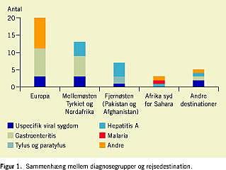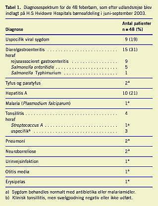 Resultater: I alt 48 patienter blev inkluderet; 56% var børn af indvandrere. Femten (31%) havde diare/gastroenteritis, heraf var seks tilfælde forårsaget af nontyfoide Salmonella -species. Ni patienter (19%) blev udskrevet med diagnosen uspecifik viral infektion, mens ni (19%) havde en almindeligt forekommende infektion med et identificeret focus. To patienter havde henholdsvis tyfus og paratyfus. Ti (21%) havde en serologisk verificeret hepatitis A-infektion. Der blev konstateret et tilfælde af malaria og to tilfælde af neuroborreliose. Tyfus/paratyfus, hepatitis A og malaria blev udelukkende diagnosticeret hos børn af indvandrere, som havde været på besøg i deres hjemland.