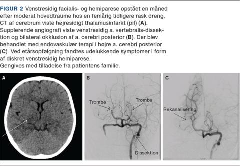 Cerebrale arteriopatier er hyppigt forekommende og findes hos 18-53% af børn med iskæmisk apopleksi [1, 6, 13]. Betegnelsen cerebrale arteriopatier indbefatter forskellige vaskulære abnormiteter med arteriel dissektion som den hyppigste efterfulgt af post varicella-angiopati, moyamoyasygdom, fokal cerebral arteriopati og vaskulitis i centralnervesystemet (se eksempel i Figur 2). Konstatering af udløsende arteriopati er afgørende, idet risikoen for recidiv varierer med typen. I et prospektivt studie fandt man, at risikoen – inden for det første år – var 32% ved moyamoyasygdom, 25% ved fokal cerebral arteriopati og 19% ved arteriel dissektion [14].