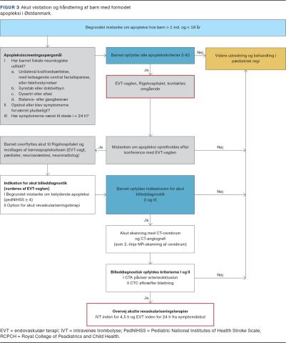 I Østdanmark blev der i 2017 implementeret en klinisk, multidisciplinær strategi for akut visitation og modtagelse af børn med formodet apopleksi (Figur 3). Med strategien bliver børn med symptomer på akut apopleksi – konstateret præhospitalt eller på en lokal børneafdeling – konfereret direkte med den neurologiske EVT-vagt på Rigshospitalet. EVT-vagten modtager 6-10 opkald hver måned om børn med formodet apopleksi. I de tilfælde, hvor EVT-vagten anser apopleksi for sandsynlig, og der samtidig findes mulighed for IVT eller EVT, overflyttes barnet akut til Rigshospitalet og modtages her af et tværfagligt team bestående af en EVT-vagt og pædiater. Hvis EVT-vagten efter klinisk vurdering anser mistanken om akut apopleksi for fortsat begrundet, udføres der CTC og CT-angio (CTA). CTC anvendes til at udelukke blødning og eventuelt vise tidlige infarkttegn, og CTA, inklusive halskar, anvendes til påvisning af karokklusion og eventuel halskardissektion.