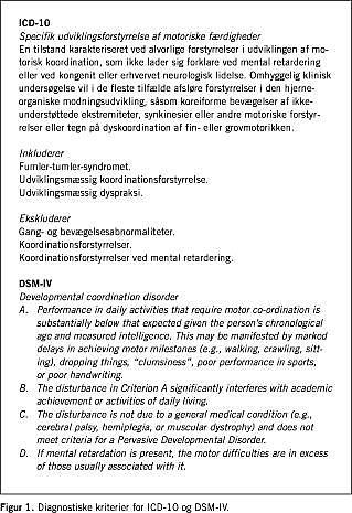 Børn med specifik udviklingsforstyrrelse af motoriske færdigheder har tidligere været diagnosticeret efter mange og højst forskellige kriterier, hvis reliabilitet har været problematisk. Ved indførelsen af officielle diagnostiske kriterier for developmental coordination disorder og med anbefalinger af en bestemt undersøgelsesmetode er der skabt et godt grundlag for det fortsatte kliniske arbejde og evidensbaserede videnskabelige studier. I artiklen gennemgås de diagnostiske kriterier foruden undersøgelsesmetode, prævalens, behandling og prognose.