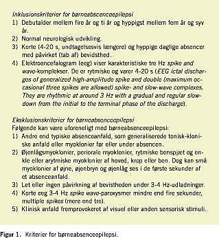 Kriterierne for BAE er senest opdateret i 2000 [2] og er vist i Figur 1 . Kriterierne for JAE er senest opdateret i 1999 [3]. Sygdommen debuterer omkring puberteten (> 10 år) hos et normalt udviklet barn. Absencerne er mindre hyppige end hos børn med BAE, de er ikke altid daglige, og børnene har ofte tillige generaliserede tonisk-kloniske anfald. Iktal elektroencefalogram (eeg) viser samme forandringer som ved BAE, dog kan spike wave -aktiviteten være lidt hurtigere (3,5-4,5 Hz).
