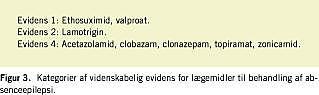 Tidsskriftet Clinical Evidence bragte i 2002 en analyse af randomiserede kontrollerede undersøgelser (RCT) over behandling af absenceanfald hos børn [7]. I analysen er der ikke skelnet mellem BAE og JAE. Effektmål var anfaldsfrihed i form af normalisering af eeg eller bivirkninger af behandling. Konklusionerne af analysen er anført i Figur 2 .