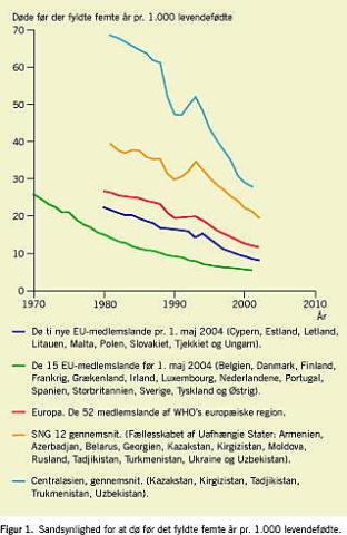 Ser man på den globale udvikling inden for børnesundhed, målt i hvor høj grad verdenssamfundet er i stand til at opfylde de såkaldte årtusindemål, ser situationen alt andet end lys ud. I mange lande, specielt syd for Sahara i Afrika, har man oplevet stagnerende eller ligefrem stigende børnedødelighed. I den europæiske region er tendenserne blandede. De gamle EU-lande og i noget mindre grad de »nye« EU-lande har alle oplevet en betragtelig reduktion i spædbørnsdødeligheden gennem de seneste ti år. Dette på trods af at spædbørnsdødeligheden initialt var på et lavt niveau, og at der ikke har været iværksat interventioner specielt rettet mod at reducere børnedødelighed ud over fremskridt generelt i behandling og forebyggelse af børnesygdomme og problemer i spædbørnsperioden. Ser man derimod på flere af landene fra det tidligere Sovjetunionen, og specielt landene i Centralasien, tegner der sig et mindre positivt billede. I forbindelse med opløsningen af Sovjetunionen oplevede man i flere lande en stigning i børnedødeligheden, og i tiden derefter har reduktionen været moderat, hvis ikke stagnerende. Flere af landene vil ikke kunne opfylde årtusindemålene, hvis situationen ikke ændres [3, 4]. Manglende og ufuldstændig rapportering af børnedødelighed og forskelle i definitionen af kriterier for, at et spædbarn registreres som levendefødt, gør, at den reelle børnedødelighed i disse lande er endnu højere end officielt rapporteret (Figur 1).