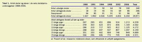 De seks skolebørnsundersøgelser fra 1988 til 2006 er repræsentative for 11-, 13- og 15-årige elever. De seks undersøgel-ser er sammenlignelige, fordi sampling' en af skolerne er foregået på samme måde (tilfældig udvælgelse fra en total liste