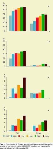 I studierne fra 1988, 1991 og 1994 var de »nej« og »ja«, i undersøgelserne fra 1998, 2002 og 2006 var de »nej«, »ja en enkelt gang« og »ja flere gange«. Ændring fra to til tre svarkategorier kan have betydning for den målte prævalens af lægemiddelbrug, men stigningen i anvendelse af lægemidler observeres både i de tre første undersøgelser og i de tre seneste undersøgelser. På grundlag af de ovennævnte valideringsstudier [9, 10] fæster vi lid til selvrapporterede data fra unge om brug af
