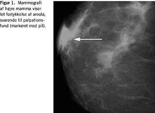 Parakliniske undersøgelser: En mammografi viste let fortykkelse af areola i overensstemmelse med palpationsfundet. (Figur 1 ). Forandringerne var derimod ikke synlige på den samtidigt foretagne ultralydscanning. Processen blev biopteret med stansebiopsi. En histologisk undersøgelse viste pseudolymfom, og på anbefaling fra patologisk afdeling blev der foretaget måling af Borrelia -antistof. Der påvistes en forhøjet Borrelia burgdorferi- antistof IgG-titer på 497 (ref. < 6 U pr. ml), og patienten påbegyndte behandling med tablet phenoxymethylpenicillin 1,5 MIE × 3 i ti dage. Ved klinisk kontrol på Brystkirurgisk Klinik seks uger senere målte den skiveformede fortætning 8 mm × 8 mm × 2 mm og var således formindsket til en tredjedel af den oprindelige diameter. Der fandtes ikke indikation for kirurgisk intervention. Ved afsluttende kontrol en måned efter penicillinbehandlingen, kunne processen ikke genfindes.