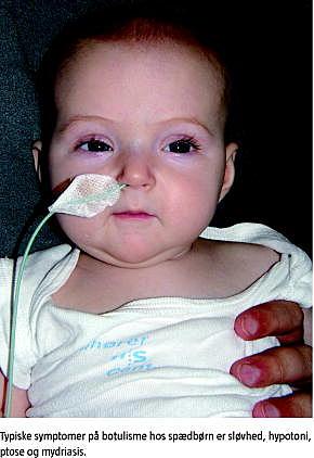 En tidligere rask og normalt udviklet pige, der var 4,5 måneder gammel, blev indlagt efter fire dage med tiltagende sløvhed. Hun havde sidst haft afføring seks dage før indlæggelsen og havde ikke meldt sig til måltider det seneste døgn. Der var ingen opkastninger eller feber. Objektivt var hun udtalt sløv og universelt hypoton med svækkede dybe senereflekser og kun sparsom reaktion på venepunkturer. Oversigt over abdomen viste tegn til paralytisk ileus. Colonindhældning var normal, og hun kvitterede en stor mængde afføring herefter. Hun blev behandlet symptomatisk med intravenøs væske og sondeernæring og blev udredt med computertomografi og magnetisk resonans-undersøgelse af cerebrum, lumbalpunktur, elektroencefalografi, urinscreening for metabolisk sygdom og medikamenter samt almindelige blodprøver uden patologiske fund. Der blev konstateret bilateral ptose og mydriasis, og otte dage efter indlæggelse blev der rejst mistanke om botulisme. Denne diagnose blev bekræftet på Statens Serum Institut ved inokulation af mus med patientens serum, og pigen blev behandlet intravenøst med Clostridium (C.) botulinum -antitoksin samt ampicillin og metronidazol. Hun viste efter få dages behandling klar klinisk fremgang, og der blev aldrig behov for respiratorisk støtte. Der var behov for supplerende sondeernæring indtil udskrivelsen efter samlet 19 dages indlæggelse, og ved ambulant kontrol to måneder senere var der fuld restitution.