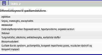 Selv om fødevarebåren botulisme - »pølseforgiftning« - i Danmark er en meget sjælden form for fødevareforgiftning, er den kendt af de fleste læger. I modsætning hertil er spædbarnsbotulisme (SB) et mindre kendt og muligvis underdiagnosticeret syndrom. Hvor fødevarebåren botulisme skyldes indtagelse af fødevarer med præformeret toksin, skyldes SB indtagelse af sporer. Sporerne omdannes i tarmkanalen til toksinproducerende bakterier. Kolonisering kan finde sted, fordi den normale tarmflora, som hos ældre individer kan beskytte mod formering af Clostridium botulinum, endnu ikke er stabil hos spædbørn. Efter kolonisering frigøres botulinumtoksin, som optages gennem tarmvæggen. Tilstanden har et bredt klinisk spektrum, der strækker sig fra let kranienervepåvirkning, hypotoni og obstipation til progredierende generaliseret symmetrisk slap parese og respiratorkrævende kompromitteret respiration. Kendskab til denne potentielt fatale tilstand er vigtig. Tidlig diagnose og behandling med antitoksin er afgørende, eftersom en betragtelig andel af børnene i modsat fald vil få behov for langvarig og intensiv understøttende behandling [1-3].