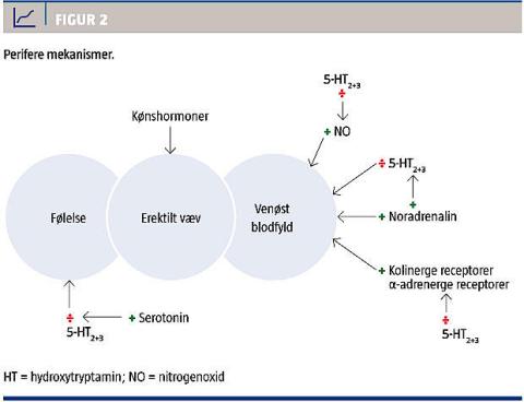 Den seksuelle funktion er i høj grad influeret af det centrale og perifere neurotransmittersystem [1, 8], og AD-induceret seksuel dysfunktion kan bl.a. henføres til ændringer i inhiberende eller exciterende centrale og/eller perifere neurotransmittere. Overordnet set hæmmer serotonin den seksuelle lyst og orgasme, mens dopamin fremmer begge (Figur 1).