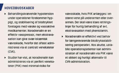 Behandlingskrævende hypotension under operationer er en hyppig hændelse. I et nyligt publiceret prospektivt klinisk studie angav man, at 16,4% af patienterne fik en eller flere episoder med hypotension under operationen [1]. Længerevarende hypotension kan medføre alvorlige postoperative komplikationer pga. hypoperfusion af vitale organer såsom nyrer, hjerne og hjerte [2]. Optimering af det kardiovaskulære system og herved stabilisering af blodtrykket kan foretages med væsketerapi og administration af vasoaktive stoffer. Ephedrin og phenylephrin er de hyppigst anvendte vasoaktive stoffer. Ved behov for længerevarende blodtryksstabilisering har begge stoffer deres begrænsninger [3, 4]. Noradrenalin (NA) kan derfor overvejes i situationer med behov for længerevarende vasoaktiv behandling. NA administreres normalt via et centralt venekateter (CVK), da det er en kraftig vasokonstriktor, hvorfor der ved kontinuerlig indgivelse af NA via et perifert venekateter (PVK) er risiko for ekstravasation og iskæmisk vævsskade [5, 6]. Anlæggelse af CVK er kun berettiget ved større operationer hos patienter med en begrænset kardiovaskulær reserve [3]. Formålet med denne artikel er at beskrive de hyppigst anvendte vasoaktive medikamenter, diskutere fordele og ulemper ved perioperativ administration af NA via PVK samt angive retningslinjer for brug af NA via PVK.