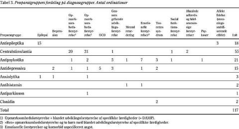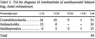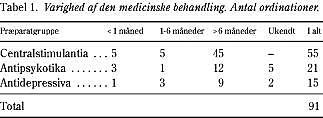 De anvendte præparatgrupper er anført i Tabel 1 , hvor varigheden af behandlingen ligeledes er anført. Heraf ses at centralstimulantia udgjorde 55 ordinationer, heraf fem med under en måneds varighed, fem med varighed mellem en og seks måneder og 45 med over seks måneders varighed. Antipsykotika udgjorde 21 ordinationer med 12 over seks måneder. Antidepressiva udgjorde 15 ordinationer, heraf ni med over seks måneders varighed.
